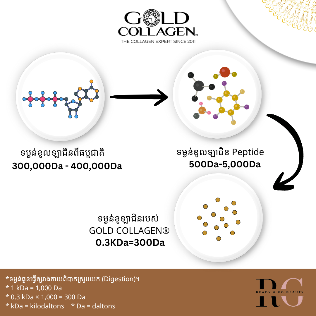 🧬⚗️ម៉ូឡេគុលខូលឡាជិនរបស់ GOLD COLLAGEN® មានទម្ងន់ត្រឹមតែ (0.3 kDa = 300 Da) ខណះខូឡាជិន Peptides ទូទៅមានទម្ងន់ចន្លោះពី 500Da -5,000Da។